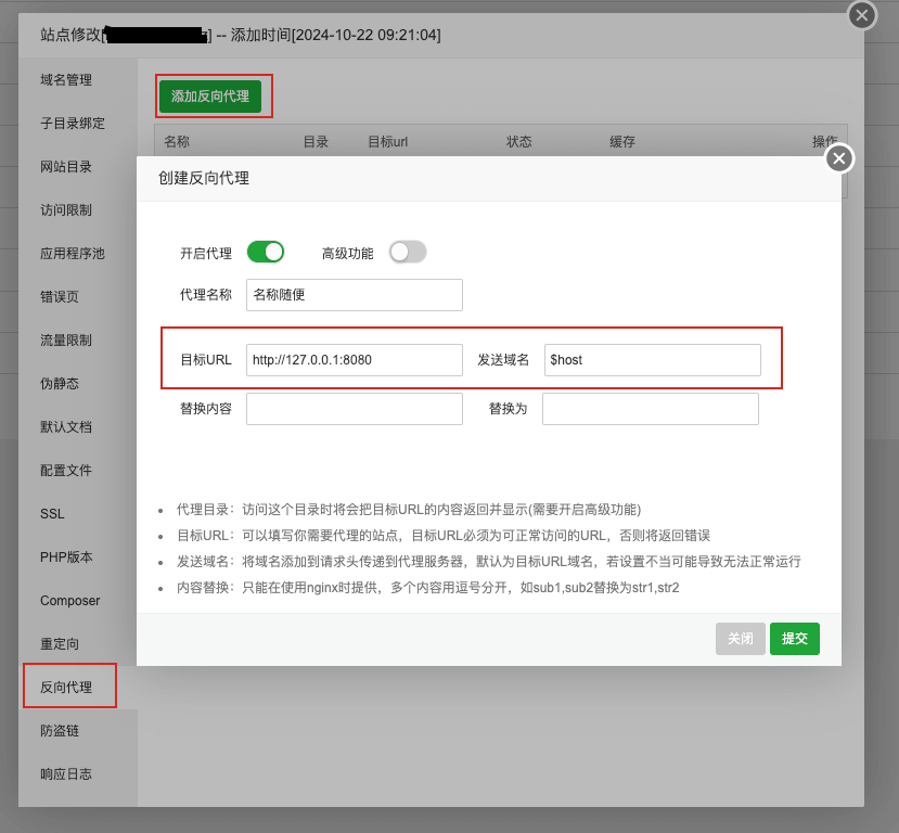 添加站点后配置反向代理到8080端口,配置即可通过域名进行访问